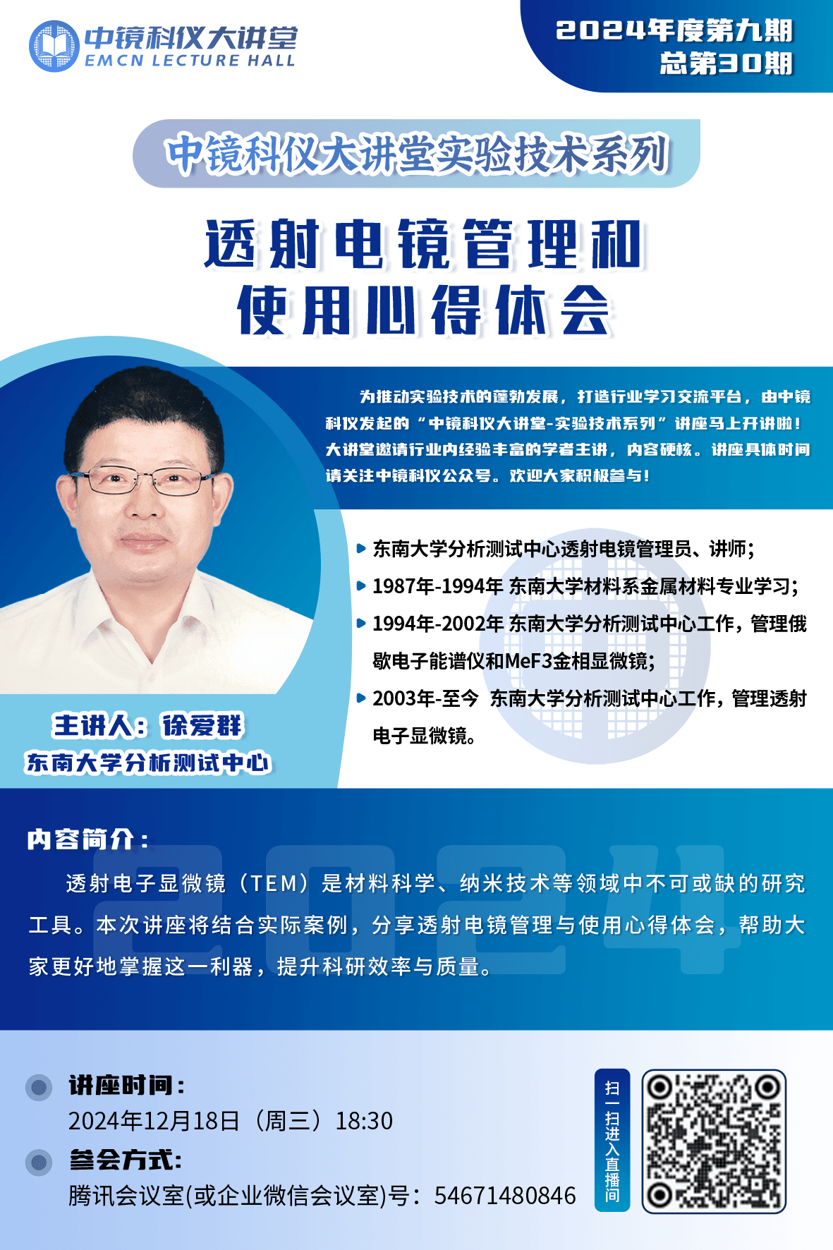 2024年“中鏡科儀大講堂”第九期-“實(shí)驗(yàn)技術(shù)系列”講座將于2024年12月18日18:30開講。本期由東南大學(xué)分析測試中心透射電鏡管理員徐愛群講師帶來的《透射電鏡管理和使用心得體會(huì)》專題講座將詳細(xì)介紹透射電鏡常用的數(shù)學(xué)概念、晶體學(xué)基本知識(shí)與電子衍射的關(guān)系等內(nèi)容,分享透射電鏡的管理和使用心得。歡迎大家積極參與,共同推動(dòng)實(shí)驗(yàn)技術(shù)的發(fā)展! 講座時(shí)間: 2024年12月18日(周三)18:30 參會(huì)方式: 騰訊會(huì)議室(或企業(yè)微信會(huì)議室)號(hào):54671480846 掃碼進(jìn)入微信視頻號(hào) 掃碼關(guān)注中鏡科儀