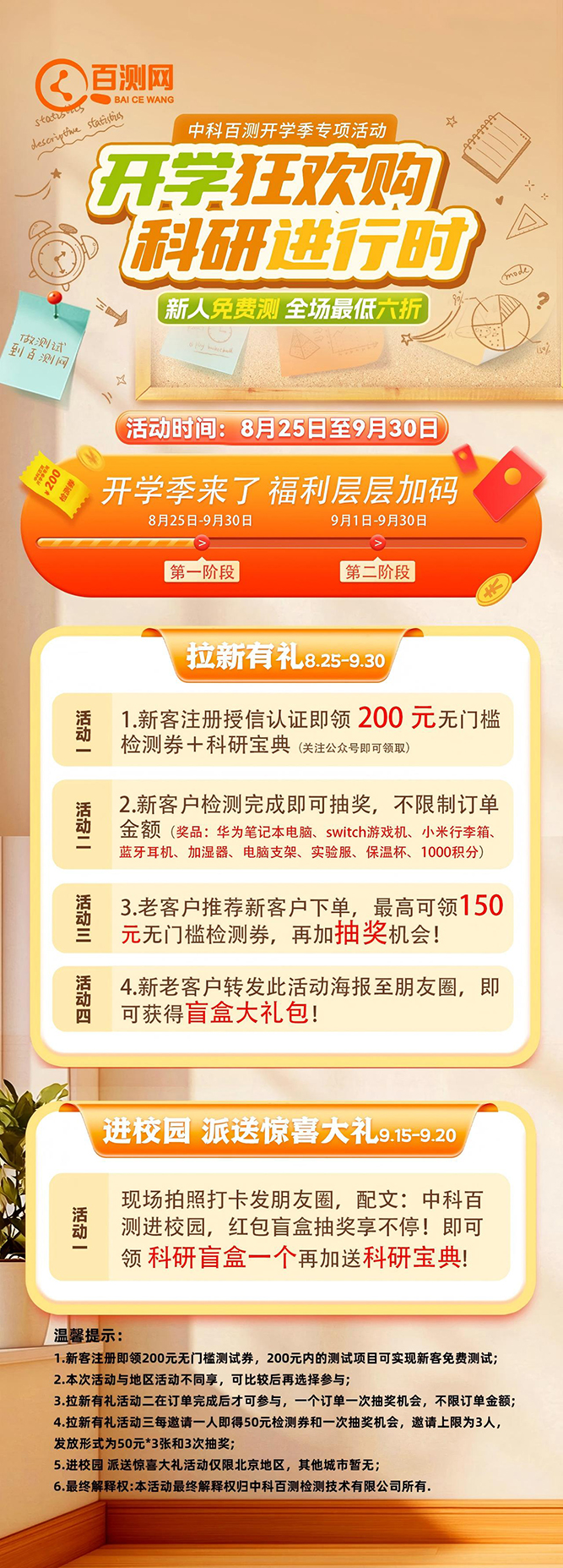 開學科研福利狂歡!新客注冊即領200元免費測,抽華為電腦/Switch壕禮! 【新學期科研福利上線】 注冊有禮、檢測抽獎、推薦返券、轉發得盲盒——多重驚喜等您來! 活動時間:8月25日-9月30日 活動介紹: 活動一:新客注冊即領200元無門檻檢測券 + 科研寶典(關注公眾號即可領取)! 注冊完成后,點擊“個人中心”—“信用賬戶”—“授信認證”,填寫信息后提交,等待后臺審核通過后,即可獲得200元無門檻優惠券!優惠券可在“個人中心”—“我的優惠券”中查看!(可以掃碼添加科研顧問催審核進度噢~) 將二維碼下載或截圖,轉發給被邀請人 被邀請人掃描轉介紹二維碼添加科研顧問 被邀請人通過科研顧問分享的鏈接注冊賬號,并完成授信認證,即算老客戶成功邀請一名新客戶 活動四:新老客戶轉發活動海報至朋友圈,即可獲得科研盲盒大禮包! 領取盲盒禮品:掃描活動二中的二維碼添加科研顧問! 進校園特別活動:9.15-9.20(僅限北京地區) 活動說明: 了解更多詳情請查看下方活動海報,或掃描活動二中的二維碼添加科研顧問咨詢/參與活動!