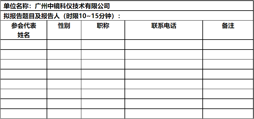 關于2012年度學會年會的通知(第一輪) 各會員單位: 廣東省電鏡學會理事會定于2012年12月22~24日在河源舉辦2012年度學術年會。本次會議的主要議題包括:學會年度總結、專題學術報告和新型儀器設備技術介紹。 歡迎會員單位電鏡同行以及剛剛加入我們學會的共聚焦的專家學者踴躍報名參加,介紹近期各自的研究工作,增強會議學術氣氛,豐富會議內容,敬請于11月30日前填妥回執表,將參加人員數和報告題目告知學會秘書。以便會議安排及發第二輪正式通知。(電話/Email 告知均可) 具體事宜如下: (1)參會代表在指定地點集中登車,前往會議地點。 (2)會議地點:河源天上人間溫泉酒店 (3)會務費:800元/人(包含交通、食宿費及參觀費用) 會議期間,請各單位交納2012年度會費,理事長、副理事長單位200元,理事單位150元,一般會員單位100元。 聯系人:路艷蒙(學會秘書) 通訊地址:510515,廣州市同和南方醫科大學分析測試中心 電話:020-61648174(辦) 13660510858(手機) E-mail:luyanmeng@hotmail.com, yanmenglu@yahoo.com.cn 廣東省分析測試協會電子顯微鏡專業委員會 2012-11-20 廣東省電鏡學會 關于2012年度學會年會 參會回執 注:請各會員單位確保上報名單中參會代表的到會,避免臨時缺席帶來不必要的損失。(若攜帶家屬,請將家屬姓名也填入表格,并在備注中說明)