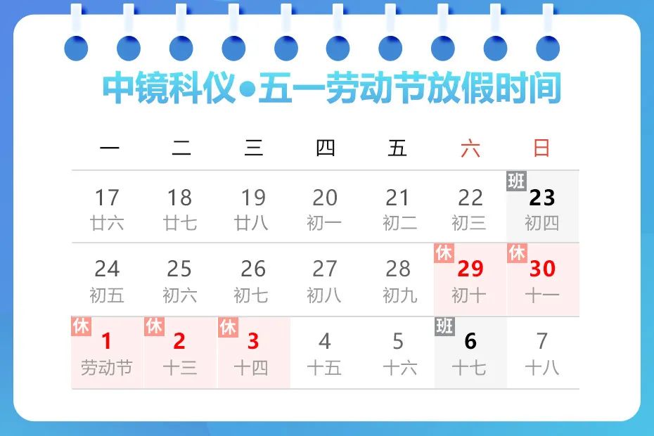 心有所向,勞有所獲。在萬物更新的春日,我們迎來了全世界勞動者最盛大的節日——五一國際勞動節!勞動是世界上一切歡樂和一切美好事情的源泉。勞動創造人類,勞動創造世界,勞動更創造未來。在此,中鏡科儀向所有平凡而偉大的勞動者——致敬! 放假通知 中鏡科儀五一勞動節放假時間: 2023年4月29日(星期六)至2023年5月3日(星期三)放假,共5天; 2023年4月22日(星期六)調休; 2023年4月23日(星期日)、2023年5月6日(星期六)正常上班。 假期商城不打烊,客服不下線,如有需求歡迎隨時聯系!感謝大家一直以來對中鏡科儀的支持與信任! 春夏季氣候多變,大家外出一定要注意防護,佩戴好口罩,勤洗手消毒,注意出行安全,度過一個快樂、平安的節日假期。 聯系我們 公司官網:m.asvenus.cn 免費熱線/企業QQ:400 001 9621 市場部郵箱:zjky@emcn.com.cn 官方商城 :http://www.emcn.net.cn/ 地區負責人聯系方式 北京地區:張經理 18642002287 南京地區:鄭經理 15050567596 廣州地區:鄭經理 13724052586 西安地區:馬經理 13324587366 沈陽地區:王經理 15140221479 鄭州地區:唐經理 15237816868