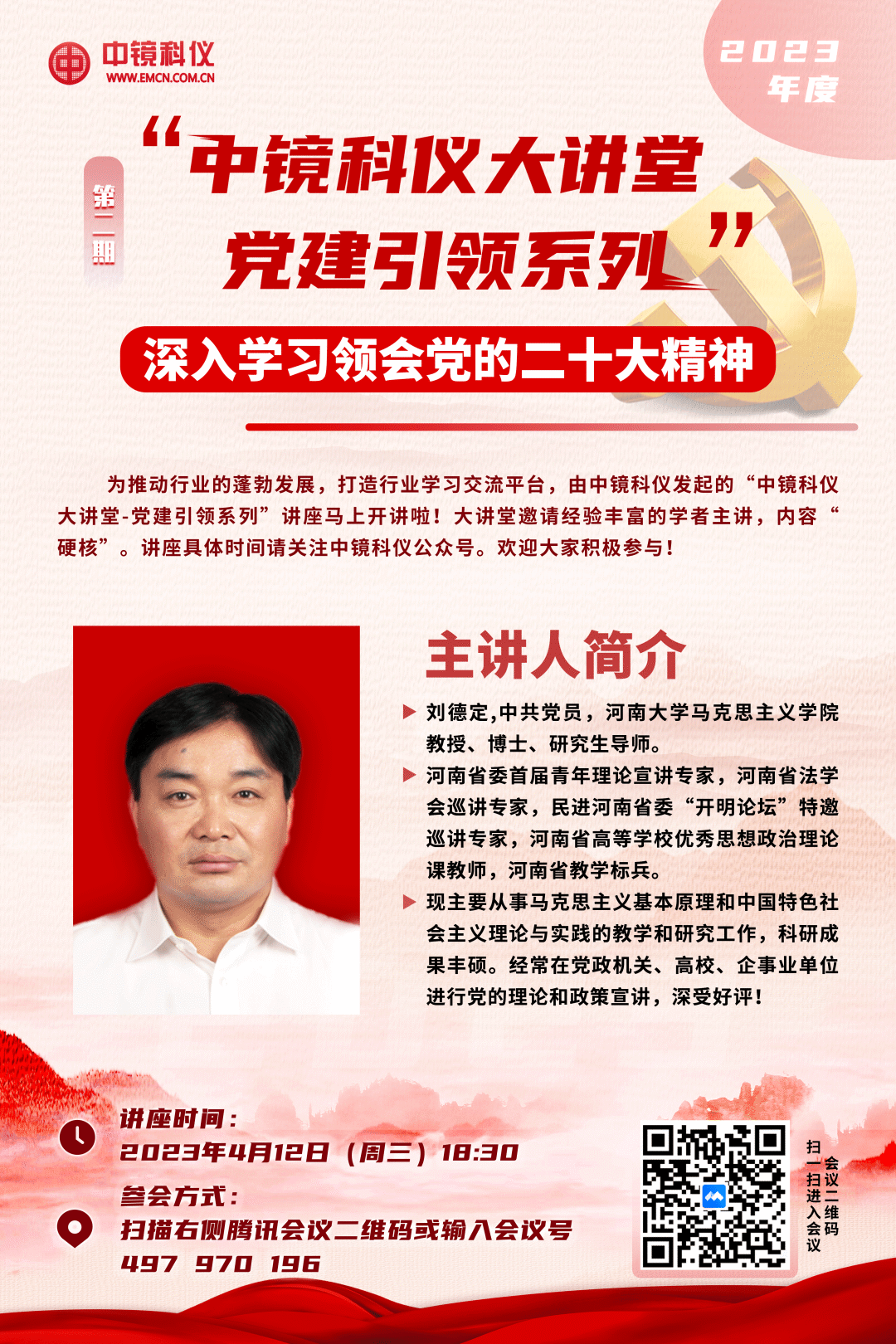第二期:深入學(xué)習(xí)領(lǐng)會(huì)黨的二十大精神 為深入學(xué)習(xí)貫徹黨的二十大精神,發(fā)揮黨建引領(lǐng)作用,深化黨建工作內(nèi)涵,由中鏡科儀發(fā)起的2023年“中鏡科儀大講堂”第二期-“黨建引領(lǐng)系列”講座圓滿結(jié)束! 本期特邀河南大學(xué)馬克思主義學(xué)院劉德定教授為大家?guī)?lái)了《深入學(xué)習(xí)領(lǐng)會(huì)黨的二十大精神》專題講座。劉教授用樸實(shí)有力的語(yǔ)言,重點(diǎn)從二十大的主題和新時(shí)代十年來(lái)的主要成果、以中國(guó)式現(xiàn)代化全面推進(jìn)中華民族偉大復(fù)興、黨和國(guó)家事業(yè)的新部署新要求等方面全面介紹了二十大精神的實(shí)質(zhì)和內(nèi)涵。內(nèi)容詳實(shí),深入淺出,精彩非凡! 現(xiàn)將本期講座回放發(fā)布,供大家學(xué)習(xí),歡迎大家觀看! 點(diǎn)擊觀看中鏡科儀大講堂-深入學(xué)習(xí)領(lǐng)會(huì)黨的二十大精神視頻回放