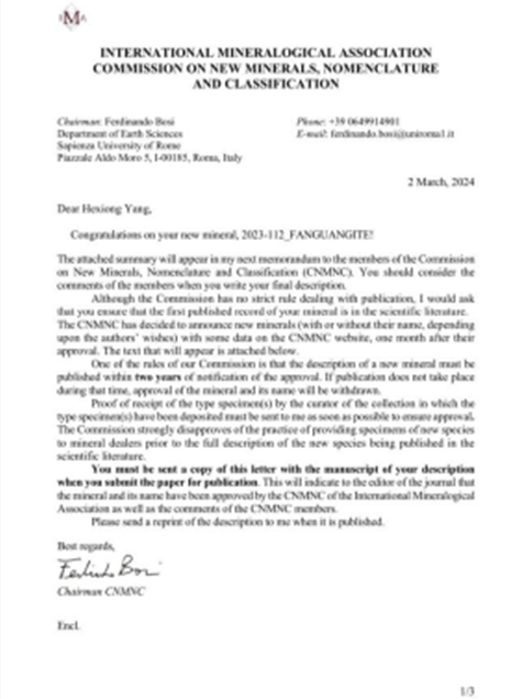 【新聞資訊】喜報!中國地質學家范光,獲“范光鉬礦(Fanguangite)”國際礦物學協會(IMA)新礦物命名