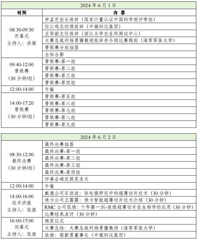 第二屆“中鏡科儀杯”超薄切片大賽 第三輪通知 第二屆“中鏡科儀杯”超薄切片大賽經(jīng)過(guò)主辦單位和承辦單位的積極籌備和第一階段預(yù)賽,由大賽組委會(huì)專家對(duì)收到的報(bào)名信息以及預(yù)賽視頻資料仔細(xì)審核,已擇優(yōu)選出入圍決賽的選手63位、特邀選手2位(入圍選手和特邀選手名單見(jiàn)第二輪通知),現(xiàn)將決賽的具體安排通知如下: 一、決賽時(shí)間:2024年5月31日~ 6月3日。5月31日?qǐng)?bào)到, 6月3日離會(huì)。 二、決賽地點(diǎn):浙江大學(xué)紫金港校區(qū)農(nóng)生組團(tuán)C座農(nóng)生環(huán)測(cè)試中心(靠近學(xué)校東三門(mén))。入校報(bào)備手續(xù)統(tǒng)一辦理,可以全天進(jìn)出校門(mén)。 三、住宿及報(bào)到地點(diǎn):浙大圓正啟真水晶酒店(西湖區(qū)古墩路671號(hào)申悅國(guó)際A幢);標(biāo)間或大床:368元/晚。 浙江大學(xué)圓正啟真酒店(專家住宿),大床或標(biāo)間。 浙大圓正啟真水晶酒店距離賽場(chǎng)步行約15分鐘(見(jiàn)圖)。 浙大圓正啟真水晶酒店--賽場(chǎng)地圖 四、日程安排:見(jiàn)附表。 五、參賽費(fèi)用:本次大賽不收取報(bào)名費(fèi)用,入圍決賽的參賽選手須到現(xiàn)場(chǎng)參加比賽,交通及食宿費(fèi)用自理。 六、交通推薦: 1、杭州東站(高鐵):杭州東站--浙大圓正啟真水晶酒店。地鐵1號(hào)線湘湖方向,打鐵關(guān)站換乘5號(hào)線金星方向,三壩地鐵站C出口,全程約40分鐘,車(chē)費(fèi)5元。出租車(chē)車(chē)程預(yù)計(jì)40分鐘,費(fèi)用約45元。 2、杭州西站(高鐵):杭州西站--浙大圓正啟真水晶酒店。地鐵19號(hào)線永盛路方向,創(chuàng)景路站換乘5號(hào)線姑娘橋方向,三壩地鐵站C出口,全程預(yù)計(jì)35分鐘,車(chē)費(fèi)5元。出租車(chē)車(chē)程預(yù)計(jì)30分鐘,費(fèi)用約35元。 3、杭州蕭山國(guó)際機(jī)場(chǎng):蕭山國(guó)際機(jī)場(chǎng)--浙大圓正啟真水晶酒店。地鐵19號(hào)線火車(chē)西站方向,沈塘橋站換乘2號(hào)線良渚方向,三壩地鐵站C出口,全程約70分鐘,車(chē)費(fèi)8元。出租車(chē)車(chē)程預(yù)計(jì)60分鐘,費(fèi)用約120元。 七、聯(lián)系人: 浙江大學(xué)農(nóng)生環(huán)測(cè)試中心:李云琴 13735465530 中鏡科儀集團(tuán):趙勝藍(lán) 13298325853 歡迎大家蒞臨浙江大學(xué)參加本次大賽,切磋切片技藝,探索微觀世界! 中國(guó)材料與試驗(yàn)標(biāo)準(zhǔn)化委員會(huì)FC98/TC03 科學(xué)試驗(yàn)裝置標(biāo)準(zhǔn)化技術(shù)委員會(huì) 中鏡科儀集團(tuán) 2024年5月12日 附表: (大賽日程安排)