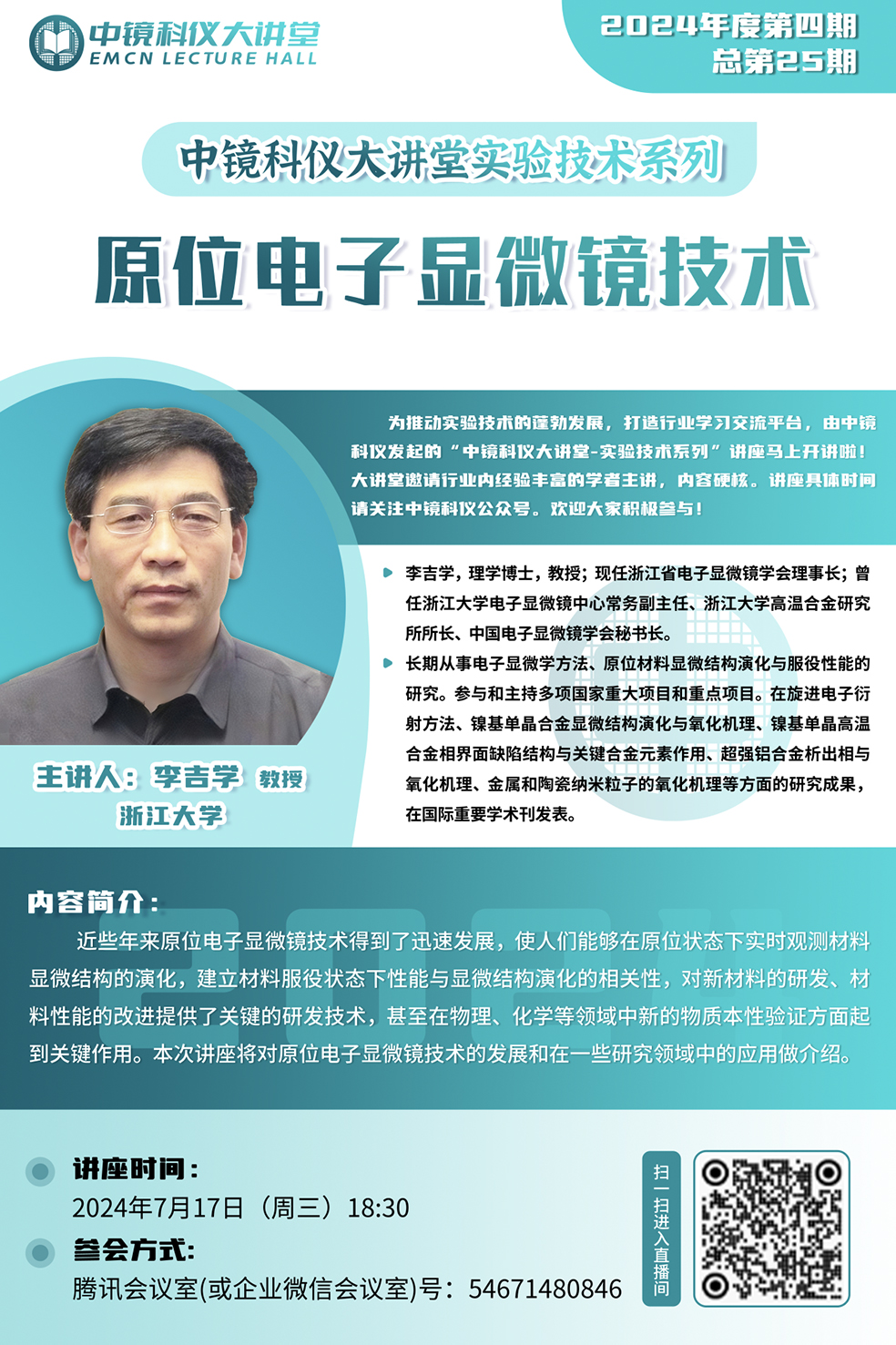 中鏡科儀發(fā)起的2024年“中鏡科儀大講堂”第四期-“實(shí)驗(yàn)技術(shù)系列”講座將于2024年7月17日18:30開(kāi)講。本期由李吉學(xué)教授帶來(lái)的《原位電子顯微鏡技術(shù)》專題講座將詳細(xì)探討原位電鏡技術(shù)的最新發(fā)展和應(yīng)用。歡迎大家積極參與,共同推動(dòng)實(shí)驗(yàn)技術(shù)的發(fā)展! 講座時(shí)間: 2024年7月17日(周三)18:30 參會(huì)方式: 騰訊會(huì)議室(或企業(yè)微信會(huì)議室)號(hào):54671480846 掃碼進(jìn)入微信視頻號(hào) 掃碼關(guān)注中鏡科儀
